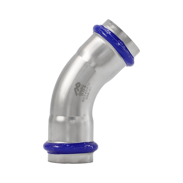 The stainless steel 45 Degree Elbow is designed to redirect flow in industrial piping systems with a smooth, angled transition. Contractors use this fitting to change pipe direction by 45 degrees while maintaining system integrity and minimizing pressure loss. Ideal for tight spaces or complex layouts, it connects seamlessly to other AP Stainless press fittings for fast, flameless installation. Made from corrosion-resistant 304 stainless steel, it’s suitable for use in water, steam, air, and chemical systems. Simply press into place using compatible tools to achieve a secure, leak-free connection that withstands demanding industrial environments.